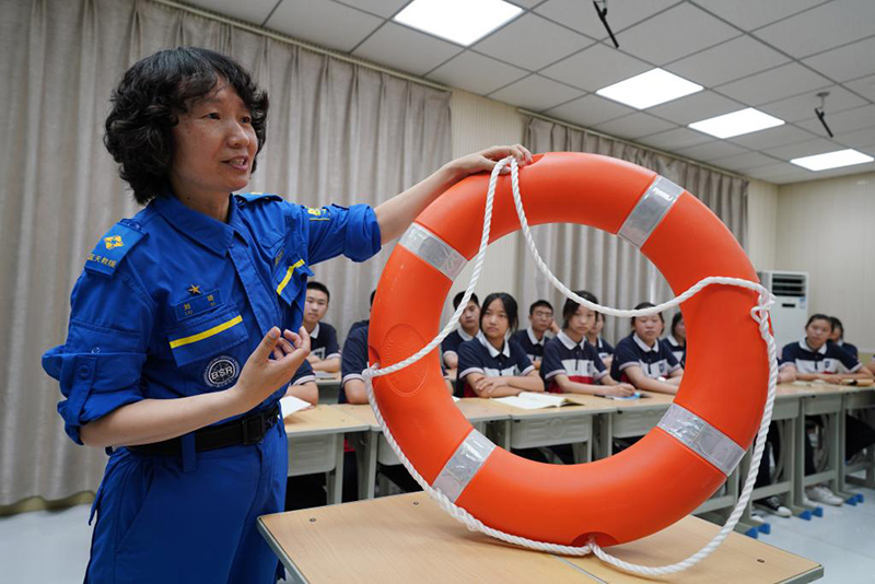 河北邢臺(tái)藍(lán)天救援隊(duì)志愿者指導(dǎo)邢臺(tái)市第八中學(xué)學(xué)生使用救生圈。(新華社記者 駱學(xué)峰/攝)