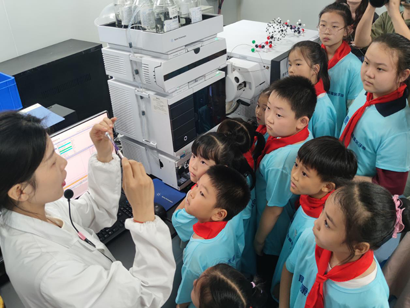 7月11日,在武漢市食品化妝品檢驗(yàn)所,工作人員向孩子們展示食品檢測(cè)過(guò)程。 (武漢市市場(chǎng)監(jiān)督管理局供圖)