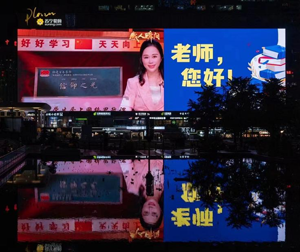 9月10日晚8點,江北嘴大劇院、渝中區(qū)WFC環(huán)球金融中心、南濱路喜來登、解放碑商圈、觀音橋商圈等標志性建筑的大型LED屏幕“準時亮燈”,一直持續(xù)到晚上9點?!肮虊?,強國有我”“老師,您好!教師節(jié)快樂!”“老師,您辛苦了!”等教師節(jié)祝福語和教師節(jié)主題海報滾動播放,表達了對全市教育工作者的節(jié)日祝福和誠摯問候。