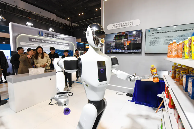 參觀者在中國(guó)高??萍汲晒灰讜?huì)上觀看展出的自動(dòng)售貨機(jī)器人。(楊素平/攝 新華社發(fā))
