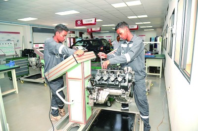 在中非職業(yè)教育合作框架和中方合作院校的幫助下,魯班工坊搭建了一個汽車維修實(shí)訓(xùn)基地,開設(shè)了涉及高級維修電工、現(xiàn)代電氣控制、液壓與氣壓傳動、自動生產(chǎn)線等在內(nèi)的多個專業(yè)實(shí)訓(xùn)室,并配備了各類先進(jìn)的教學(xué)設(shè)備、實(shí)訓(xùn)裝置、工程實(shí)踐套件等。