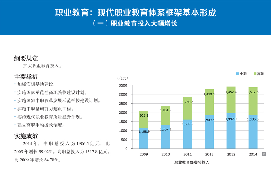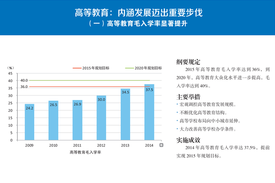 | 綱要實施成效 [學生資助:國家資助政策體系基本建立] [教師隊伍建設:高素質專業(yè)化發(fā)展顯成效] [高等教育:內涵發(fā)展邁出重要步伐] | |
