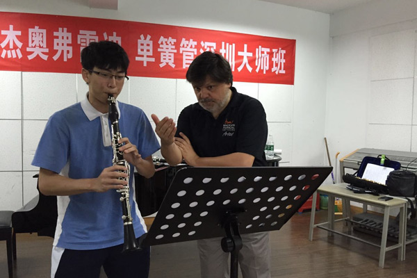 5月5日,意大利“國(guó)寶”級(jí)單簧管大師科拉多o杰奧弗雷迪Corrado Giuffredi來(lái)訪深圳藝術(shù)學(xué)校,在學(xué)校音樂廳舉行了單簧管獨(dú)奏音樂會(huì)。三百座的音樂廳坐滿了得到消息慕名前來(lái)一睹大師風(fēng)采的深圳交響樂團(tuán)的管樂演奏家,藝校的管樂專業(yè)學(xué)生及家長(zhǎng)悉數(shù)到場(chǎng)聆聽。講座還吸引了深圳管弦樂協(xié)會(huì)和廣州星海音樂學(xué)院的學(xué)子前來(lái)。5月6日,幸運(yùn)的單簧管學(xué)子在接受大師的親自教導(dǎo)后,表示在對(duì)音樂和藝術(shù)的理解上都有了新的提高,更加堅(jiān)定了要成為出色演奏家的職業(yè)理想。