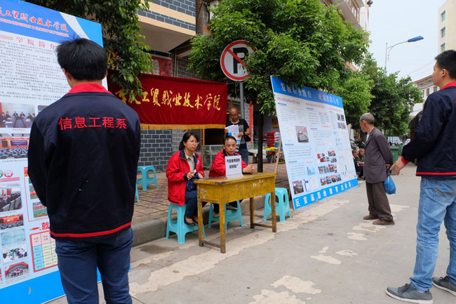 活動中,服務(wù)隊(duì)師生就百姓關(guān)心的單獨(dú)招生與普通高考的區(qū)別、學(xué)生就業(yè)情況、貧困學(xué)生資助體系、專業(yè)設(shè)置及農(nóng)民工技能培訓(xùn)與考取技能證等方面的問題做了耐心細(xì)致的解答;也通過展板、宣傳資料等多途徑向百姓介紹了我區(qū)職業(yè)教育發(fā)展所取得的豐碩成果和在“大眾創(chuàng)業(yè)、萬眾創(chuàng)新” 、職業(yè)教育為中國制造提供支撐的大背景下,職業(yè)教育學(xué)生將成就出彩人生的廣闊前景。
