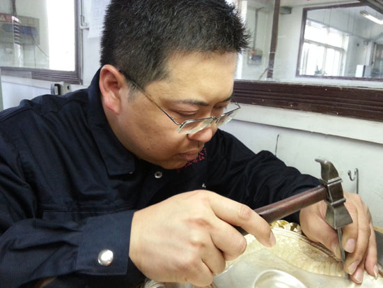 純銀絲巾果盤(pán)——北京APEC期間,我國(guó)送給各國(guó)元首的國(guó)禮,讓世人都被中國(guó)古老的鏨刻工藝驚艷。這就是鏨刻師孟劍鋒的作品。