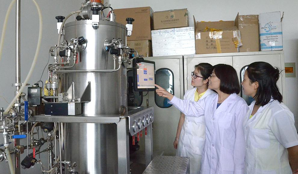 6月14日,采訪團就高?!爱a(chǎn)學(xué)研”發(fā)展情況走訪了陜西三所高校。圖為西北大學(xué)生物材料與發(fā)酵工程技術(shù)研究中心的老師正在指導(dǎo)學(xué)生操作生物發(fā)酵罐。