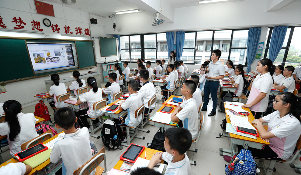 6月2日,采訪團就教育信息化推進(jìn)教育現(xiàn)代化發(fā)展走訪廣東兩所學(xué)校。圖為順峰初級中學(xué)陳劍洪老師通過“螞蟻慧學(xué)”平臺實現(xiàn)與香港圣公會圣匠中學(xué)、重慶涪陵十四中三校聯(lián)合授課。