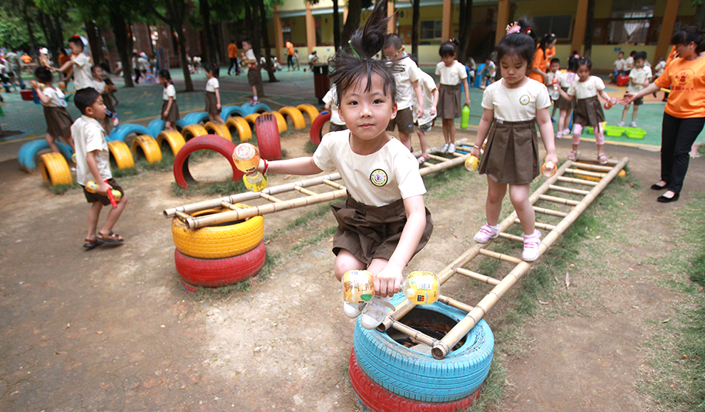 5月4日,采訪團一行走進(jìn)廣西,就推進(jìn)多元普惠幼兒園發(fā)展,走訪了南棉幼兒園和廣發(fā)重工集團幼兒園。圖為南棉幼兒園的小朋友正在“手拿啞鈴過竹梯”。
