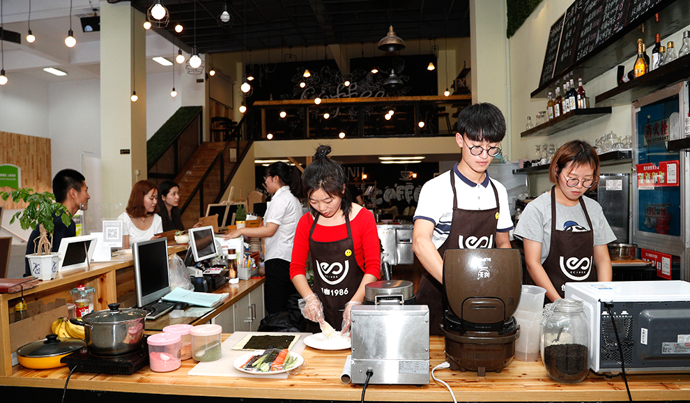 5月26日,采訪團一行走進(jìn)浙江寧波,就創(chuàng)新創(chuàng)業(yè)校園文化發(fā)展情況,走訪了寧波大學(xué)。圖為該校學(xué)生在1986創(chuàng)夢園內(nèi)自主創(chuàng)業(yè)經(jīng)營咖啡店。