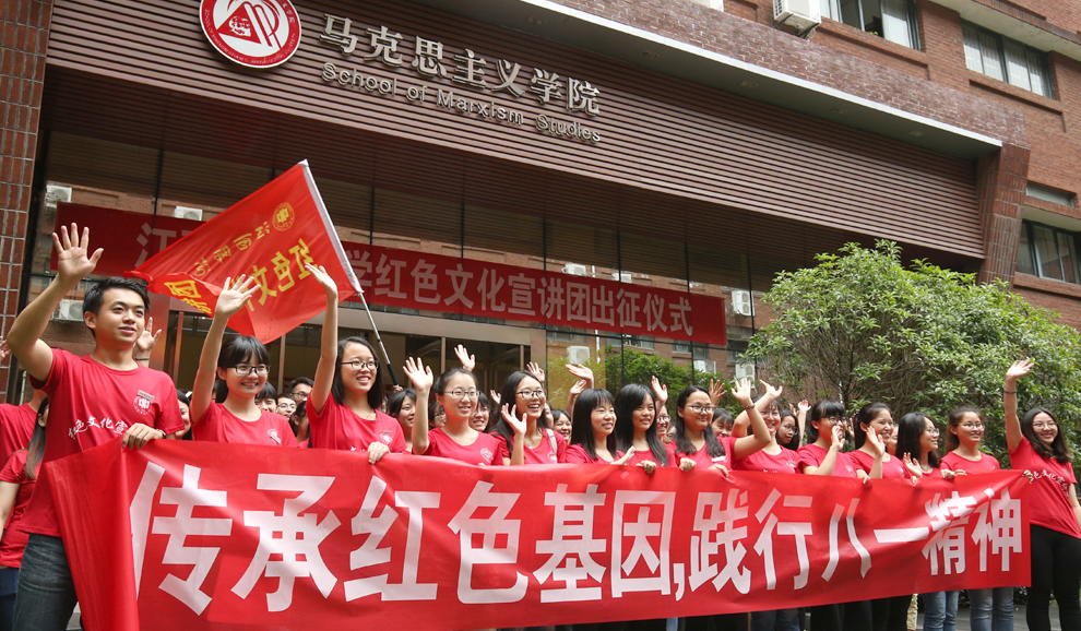 6月21日,采訪團一行走進(jìn)江西,就高校思想政治工作,走訪了江西兩所高校。圖為江西師范大學(xué)舉行“紅色文化宣講團”暑期社會實踐隊出征儀式。