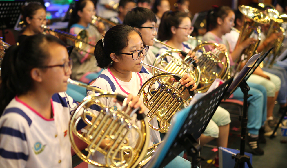 7月5日,采訪團一行走進(jìn)上海,就“內(nèi)地民族班民族團結(jié)教育”走訪了上海市共康中學(xué)。圖為該校藏族學(xué)生管樂團的學(xué)生們正在練習(xí)吹奏圓號。