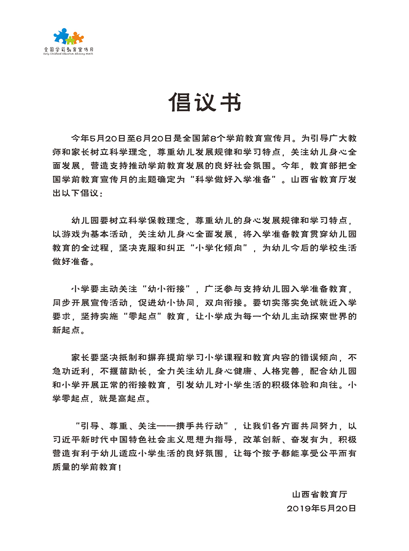 根據(jù)教育部部署,今年5月20日—6月20日為第八個(gè)全國(guó)學(xué)前教育宣傳月,活動(dòng)主題為“科學(xué)做好入學(xué)準(zhǔn)備”。5月20日上午,2019年學(xué)前教育宣傳月活動(dòng)山西省啟動(dòng)儀式在太原市杏花嶺區(qū)新建路小學(xué)富力華庭分校舉行。省教育廳黨組成員、副廳長(zhǎng)任月忠出席活動(dòng)并講話(huà)。省委編辦、省發(fā)展改革委、省公安廳、省財(cái)政廳、省人力資源社會(huì)保障廳、省自然資源廳、省住房城鄉(xiāng)建設(shè)廳、省衛(wèi)生健康委等部門(mén)相關(guān)負(fù)責(zé)同志出席啟動(dòng)儀式。來(lái)自全省高校、教研機(jī)構(gòu)、小學(xué)以及幼兒園的專(zhuān)家、校長(zhǎng)、園長(zhǎng)、教師、家長(zhǎng)及社區(qū)代表近500人參加啟動(dòng)儀式。