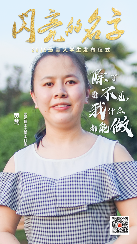 兩歲那年的一次高燒,讓黃鶯成為了一個雙目失明的女孩。生活在黑暗世界中的她卻對生活充滿了希望,她始終堅信:“除了看不見,我什么都能做。”6歲那年,在她的不懈堅持下,父母將她送入寧夏特殊教育學(xué)校學(xué)習(xí)。在學(xué)校中,疊被子、洗衣服等等一切都要靠幼小的她獨立完成。黃鶯沒有氣餒和放棄,而是勇敢地面對了生命的殘缺。初中畢業(yè)后,大部分盲人學(xué)生都選擇了接受盲人職業(yè)教育,但她不愿屈服于命運的安排,立志要通過自己的努力拓寬盲人群體的就業(yè)之路。為了夢想,她積極爭取到參加青島盲校中考的機會,雖不幸落榜,但她毅然選擇了復(fù)讀。兩年后,黃鶯以全國第四的成績考入了青島盲校普通高中部,“大學(xué)夢”成為了她新的奮斗目標(biāo)。2015年6月,她作為寧夏首位參加普通高考的盲人學(xué)生,以高出當(dāng)?shù)乩砜埔槐揪€85分的成績被武漢理工大學(xué)社會工作專業(yè)錄取。