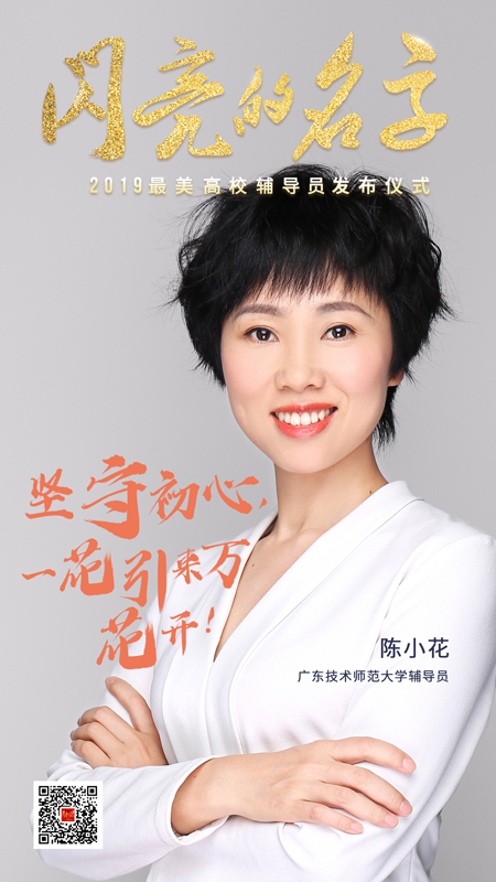 2019年,陳小花成為教育部首批“高校思想政治工作中青年骨干隊(duì)伍建設(shè)”項(xiàng)目主持人。此外,她主持的廣東省名輔導(dǎo)員“陳小花工作室”吸納來(lái)自全省10余所高校的輔導(dǎo)員,努力培養(yǎng)一批就業(yè)創(chuàng)業(yè)指導(dǎo)工作專家。近年來(lái),她多次受委派為全國(guó)、全省輔導(dǎo)員各類培訓(xùn)班授課,60余次被兄弟院校邀請(qǐng)作輔導(dǎo)員典型示范講座和專場(chǎng)輔導(dǎo)報(bào)告。