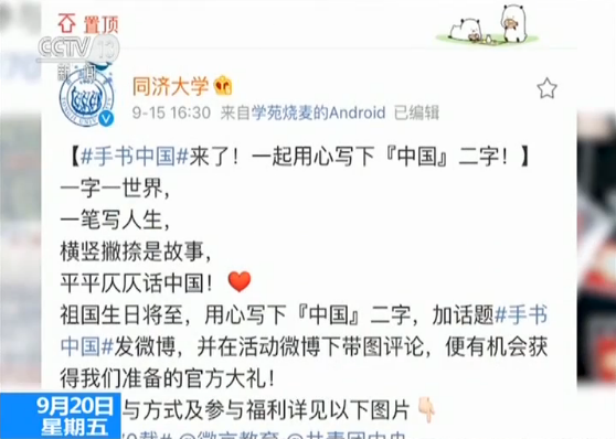 在網(wǎng)絡(luò)陣地,西南交通大學(xué)發(fā)起愛要大聲說出來#我給祖國(guó)表個(gè)白#網(wǎng)絡(luò)活動(dòng),閱讀量已經(jīng)上千萬;同濟(jì)大學(xué)推出的“手書中國(guó) 青春告白”網(wǎng)上話題引起廣泛參與,同學(xué)們還自發(fā)開展起以此為主題的線下活動(dòng),用行動(dòng)書寫出對(duì)祖國(guó)的愛。