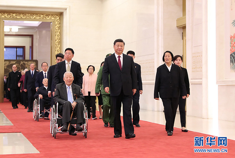 9月29日,中華人民共和國國家勛章和國家榮譽稱號頒授儀式在北京人民大會堂金色大廳隆重舉行。中共中央總書記、國家主席、中央軍委主席習近平同國家勛章和國家榮譽稱號獲得者一同步入會場。(新華社記者 丁海濤/攝)