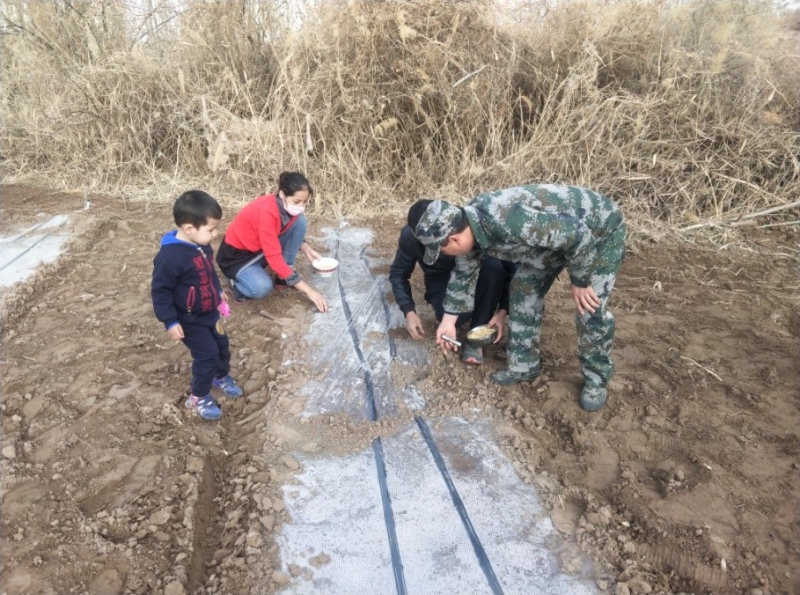 圖3 項(xiàng)目負(fù)責(zé)人在甜瓜播種現(xiàn)場親自手把手教點(diǎn)播種子