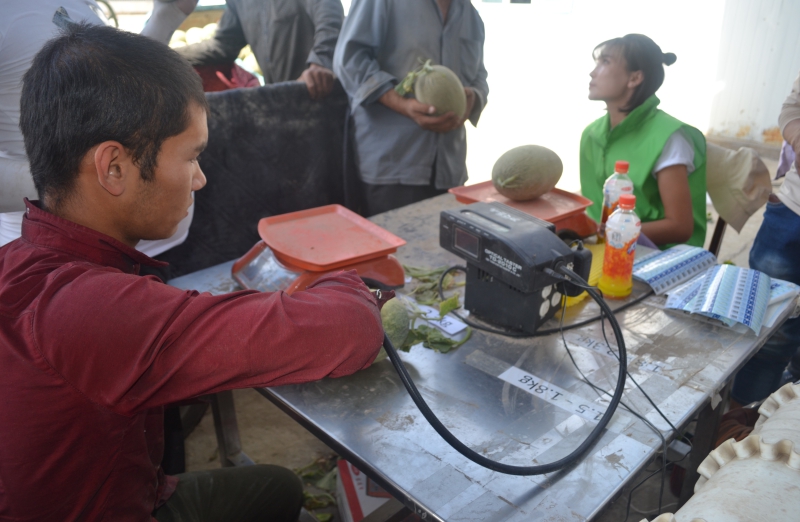 圖9 合作社組織人員對裝箱前的商品瓜重量、糖度進(jìn)行測量、貼標(biāo)簽,確保產(chǎn)品質(zhì)量