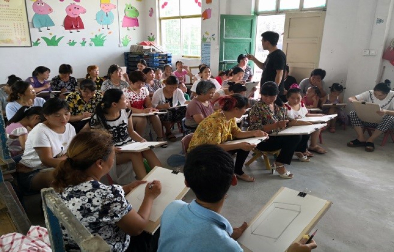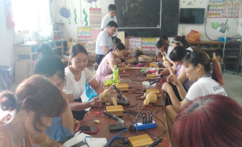 2018年下半年,中原工學(xué)院派出藝術(shù)設(shè)計(jì)學(xué)院專業(yè)教師趕赴新集村,陸續(xù)為村民開設(shè)了素描培訓(xùn)班、葫蘆烙畫培訓(xùn)班。中原工學(xué)院同時(shí)為村民購置了畫具、教程及烙畫機(jī)。目前,新集村40余人接受了培訓(xùn),20余人掌握了烙畫技術(shù)。