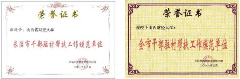 在學(xué)校的幫扶下,兩村貧困戶在2016年底全部脫貧,2017年底實(shí)現(xiàn)整村脫貧,目前整村提升正在進(jìn)行中,美麗鄉(xiāng)村建設(shè)已初見成效。學(xué)校2017年、2018年連續(xù)兩年被評為長治市干部駐村幫扶工作模范單位,校扶貧工作隊(duì)2017年被評為武鄉(xiāng)縣干部駐村幫扶模范工作隊(duì)、2018年被評為武鄉(xiāng)縣2017“三好”(好團(tuán)隊(duì)),扶貧工作隊(duì)隊(duì)長石罡明被評為全省干部駐村幫扶工作模范隊(duì)員, 扶貧工作隊(duì)隊(duì)長周紅斌被評為長治市干部駐村幫扶工作模范隊(duì)員,駐村第一書記閻懷亮被評為長治市優(yōu)秀農(nóng)村第一書記,劉文軍被評為武鄉(xiāng)縣優(yōu)秀駐村幫扶干部。