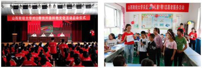 扶貧必扶智。學(xué)校把文化、科技、衛(wèi)生“三下鄉(xiāng)”活動(dòng)作為脫貧攻堅(jiān)工作的重要載體和扶貧扶智工作的有效抓手,每年暑期組織學(xué)生赴武鄉(xiāng)縣、興縣開展“三下鄉(xiāng)”社會(huì)實(shí)踐活動(dòng),為脫貧攻堅(jiān)和鄉(xiāng)村振興增動(dòng)力、添活力。2018年暑假期間,由學(xué)校209名師生組成的20支暑期“三下鄉(xiāng)”社會(huì)實(shí)踐隊(duì)伍深入興縣17個(gè)鄉(xiāng)鎮(zhèn)和部分學(xué)校、廠礦、社區(qū),開展了“攜手助力脫貧攻堅(jiān)?青春情暖革命老區(qū)”專項(xiàng)實(shí)踐活動(dòng)。實(shí)踐隊(duì)員們圍繞“美麗鄉(xiāng)村建設(shè)”和“百村千戶”兩個(gè)調(diào)研項(xiàng)目就農(nóng)戶基本情況、基層黨建、當(dāng)?shù)亟?jīng)濟(jì)建設(shè)、環(huán)境建設(shè)、文教衛(wèi)生建設(shè)等內(nèi)容開展深度調(diào)研、開展了十九大精神及鄉(xiāng)村振興戰(zhàn)略宣講、參觀晉綏革命紀(jì)念館愛國主義教育基地、關(guān)愛留守兒童、開展了普通話培訓(xùn)和素質(zhì)拓展,并為當(dāng)?shù)剞r(nóng)產(chǎn)品合作社設(shè)計(jì)商標(biāo),他們根據(jù)各自特點(diǎn)在幫扶村開展詩歌、攝影、繪畫、歌舞表演的第二課堂等內(nèi)容的實(shí)踐活動(dòng)。期間,共走入60個(gè)行政村,走訪農(nóng)戶2769戶,集中宣講61次,發(fā)放宣傳手冊2527冊,回收調(diào)查問卷3135份,關(guān)愛留守兒童377人,開展普通話培訓(xùn)1360人,開展普法教育780人,形成《大美興縣,美麗鄉(xiāng)村建設(shè)在路上》等調(diào)研報(bào)告13篇。財(cái)大學(xué)子投身精準(zhǔn)扶貧,以實(shí)際行動(dòng)助力鄉(xiāng)村振興,得到社會(huì)各界廣泛好評,受到山西衛(wèi)視、山西日報(bào)、山西青年報(bào)等各級媒體的宣傳報(bào)道。