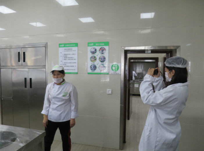 此次口岸中學(xué)之行記者首先來(lái)到了口岸中學(xué)的食堂。為了保持食堂環(huán)境的干凈衛(wèi)生,記者戴上了一次性口罩、帽子,穿上消毒的工作服后開(kāi)始了采訪、拍攝工作。