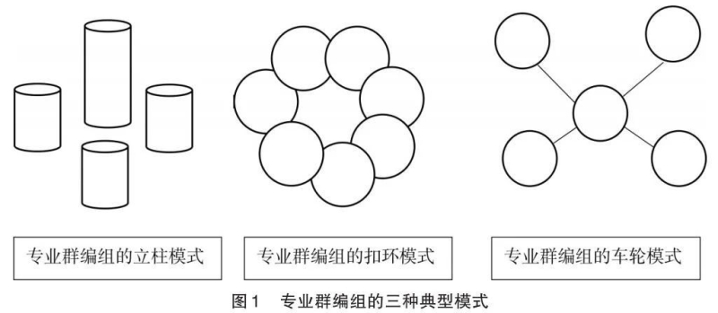 當(dāng)然,由于本科教育與高職教育專業(yè)群組建的目的不同,因而它們對知識的邏輯要求也有所不同。本科教育組建專業(yè)群的主要目的是促進(jìn)學(xué)術(shù)知識的生產(chǎn),因此其更多地從科學(xué)研究突破的角度尋求專業(yè)群編組的知識邏輯;高職教育組建專業(yè)群的主要目的是促進(jìn)技能型人才培養(yǎng),因此它更多地應(yīng)從復(fù)合型應(yīng)用人才培養(yǎng)的角度尋求知識邏輯。職業(yè)類別的多樣化決定了高職教育專業(yè)群編組需要采取不同模式,常見模式有立柱模式、扣環(huán)模式和車輪模式。立柱模式的特點(diǎn)是群內(nèi)有一個作為支柱的專業(yè),其他專業(yè)依附它而發(fā)展;扣環(huán)模式的特點(diǎn)是群內(nèi)各專業(yè)之間是交叉、并列關(guān)系,沒有哪個專業(yè)能發(fā)揮絕對的支柱或中心作用;車輪模式的特點(diǎn)是群內(nèi)有一個居于中心地位的專業(yè),但它與群內(nèi)其他專業(yè)之間的關(guān)系是平面的(見圖1)。