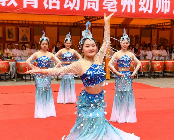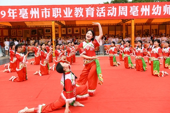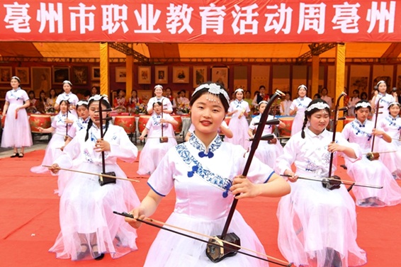 5月7日,在安徽省亳州市魏武廣場(chǎng),亳州幼師學(xué)生在“職業(yè)教育活動(dòng)周”上展示才藝。