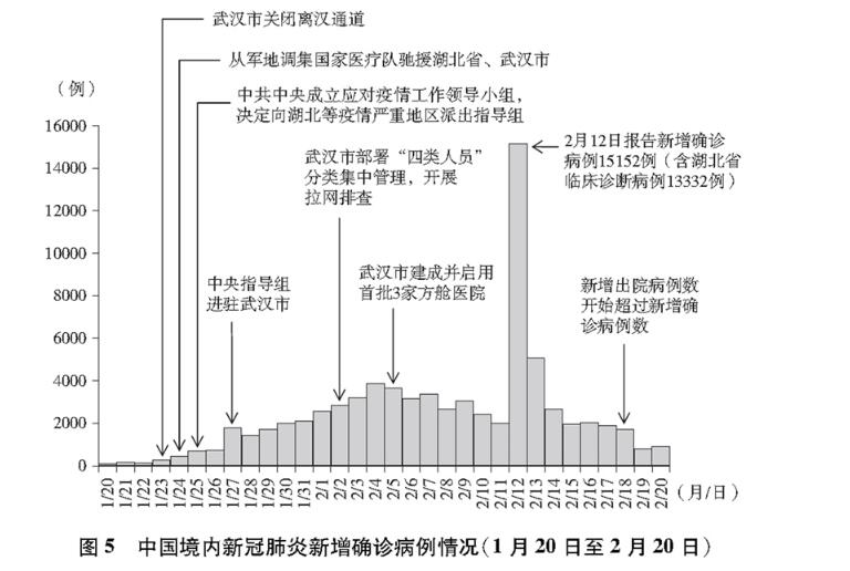 全國新增確診病例快速增加,防控形勢異常嚴峻。中國采取阻斷病毒傳播的關(guān)鍵一招,堅決果斷關(guān)閉離漢離鄂通道,武漢保衛(wèi)戰(zhàn)、湖北保衛(wèi)戰(zhàn)全面打響。中共中央成立應(yīng)對疫情工作領(lǐng)導(dǎo)小組,并向湖北等疫情嚴重地區(qū)派出中央指導(dǎo)組。國務(wù)院先后建立聯(lián)防聯(lián)控機制、復(fù)工復(fù)產(chǎn)推進工作機制。全國集中資源和力量馳援湖北省和武漢市。各地啟動重大突發(fā)公共衛(wèi)生事件應(yīng)急響應(yīng)。最全面最嚴格最徹底的全國疫情防控正式展開,疫情蔓延勢頭初步遏制。(圖5)