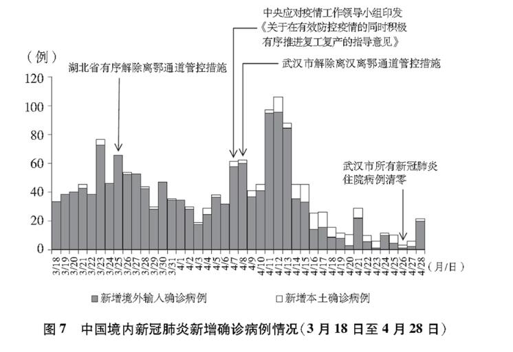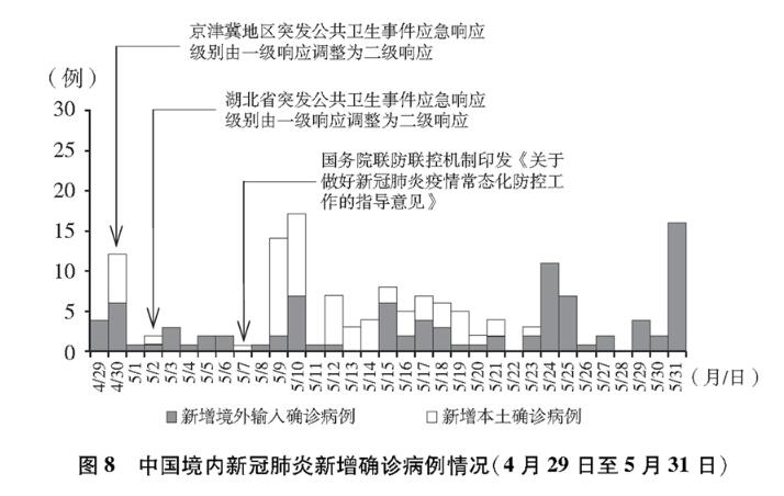 境內(nèi)疫情總體呈零星散發(fā)狀態(tài),局部地區(qū)出現(xiàn)散發(fā)病例引起的聚集性疫情,境外輸入病例基本得到控制,疫情積極向好態(tài)勢持續(xù)鞏固,全國疫情防控進入常態(tài)化。加大力度推進復(fù)工復(fù)產(chǎn)復(fù)學(xué),常態(tài)化防控措施經(jīng)受“五一”假期考驗。經(jīng)中共中央批準,國務(wù)院聯(lián)防聯(lián)控機制派出聯(lián)絡(luò)組,繼續(xù)加強湖北省疫情防控。(圖8)