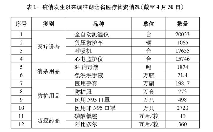 開展新中國成立以來規(guī)模最大的醫(yī)療支援行動。調(diào)動全國醫(yī)療資源和力量,全力支持湖北省和武漢市醫(yī)療救治。自1月24日除夕至3月8日,全國共調(diào)集346支國家醫(yī)療隊、4.26萬名醫(yī)務(wù)人員、900多名公共衛(wèi)生人員馳援湖北。19個省份以對口支援、以省包市的方式支援湖北省除武漢市以外16個地市,各省在發(fā)生疫情、防控救治任務(wù)十分繁重的情況下,集中優(yōu)質(zhì)醫(yī)療資源支援湖北省和武漢市。人民解放軍派出4000多名醫(yī)務(wù)人員支援湖北,承擔(dān)火神山醫(yī)院等3家醫(yī)療機構(gòu)的醫(yī)療救治任務(wù),空軍出動運輸機緊急運送醫(yī)療物資。各醫(yī)療隊從接受指令到組建2小時內(nèi)完成,24小時內(nèi)抵達,并自帶7天防護物資,抵達后迅速開展救治。在全國緊急調(diào)配全自動測溫儀、負壓救護車、呼吸機、心電監(jiān)護儀等重點醫(yī)療物資支援湖北省和武漢市(表1)。從全國調(diào)集4萬名建設(shè)者和幾千臺機械設(shè)備,僅用10天建成有1000張病床的火神山醫(yī)院,僅用12天建成有1600張病床的雷神山醫(yī)院。短短10多天建成16座方艙醫(yī)院,共有1.4萬余張床位。加強臨床血液供應(yīng),10個省份無償支援湖北省紅細胞4.5萬單位,血小板1762個治療量,新鮮冰凍血漿137萬毫升(不含恢復(fù)期血漿)。大規(guī)模、強有力的醫(yī)療支援行動,有力保障了湖北省和武漢市救治,極大緩解了重災(zāi)區(qū)醫(yī)療資源嚴重不足的壓力。