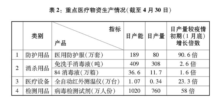 大力加強醫(yī)療物資生產(chǎn)供應(yīng)和醫(yī)療支持服務(wù)。疫情防控阻擊戰(zhàn),也是后勤保障戰(zhàn)。疫情初期,武漢市醫(yī)療防護物資極度短缺,為了節(jié)省防護用品、爭分奪秒搶救病患,一線醫(yī)護人員克服困難,最大限度地延長防護用品使用時間。為盡快解決醫(yī)療資源短缺和病患急劇增多的突出矛盾,中國充分發(fā)揮制造業(yè)門類全、韌性強和產(chǎn)業(yè)鏈完整配套的優(yōu)勢,克服春節(jié)假期停工減產(chǎn)等不利因素,開足馬力,深挖潛力,全力保障上下游原料供應(yīng)和物流運輸,保證疫情防控物資的大規(guī)模生產(chǎn)與配送。醫(yī)療企業(yè)克服工人返崗不足等困難,以最快速度恢復(fù)醫(yī)療用品生產(chǎn),最大限度擴大產(chǎn)能。其他行業(yè)企業(yè)迅速調(diào)整轉(zhuǎn)產(chǎn),生產(chǎn)口罩、防護服、消毒液、測溫儀等防疫物資,有效擴大了疫情防控物資的生產(chǎn)供應(yīng)??焖賳臃揽蒯t(yī)療物資應(yīng)急審批程序,全面加強質(zhì)量安全監(jiān)管,確保以最快的速度批準上市、促產(chǎn)保供,截至5月31日,共應(yīng)急批準17個藥物和疫苗的19件臨床試驗申請,附條件批準2個疫情防控用藥上市。在各方共同努力下,醫(yī)用物資產(chǎn)能不斷提升,醫(yī)用物資保供實現(xiàn)從“緊缺”到“緊平衡”“動態(tài)平衡”“動態(tài)足額供應(yīng)”的跨越式提升(表2)。2月初,醫(yī)用非N95口罩、醫(yī)用N95口罩日產(chǎn)量分別為586萬只、13萬只,到4月底分別超過2億只、500萬只。暢通供應(yīng)鏈條和物流渠道,建立聯(lián)保聯(lián)供協(xié)作機制,源源不斷地把全國支援物資運送到疫情防控重點地區(qū)。