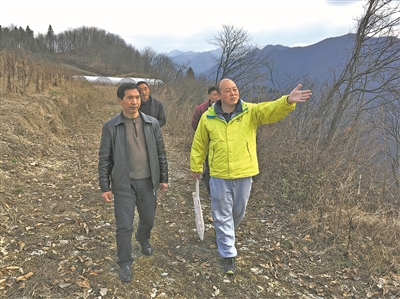 杜炳志(右一)與村委會成員、村民在山上進行神仙樹種植基地考察。