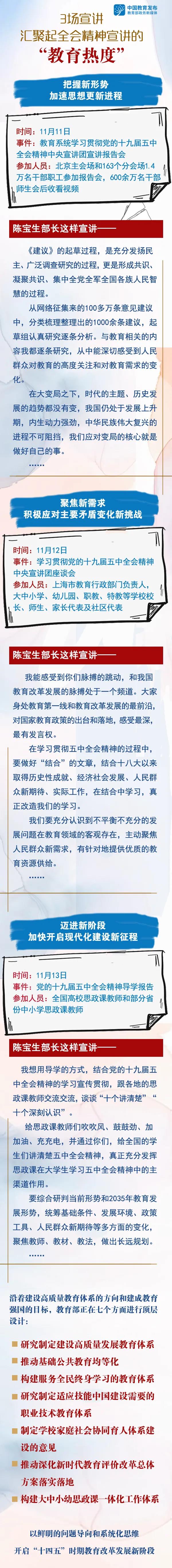 11月11日-13日,教育部黨組書記、部長陳寶生以中央宣講團(tuán)成員身份赴京滬開展教育系統(tǒng)黨的十九屆五中全會(huì)精神宣講,通過報(bào)告、座談、導(dǎo)學(xué)等多種形式,在教育系統(tǒng)匯聚起全會(huì)精神宣講的“教育熱度”——