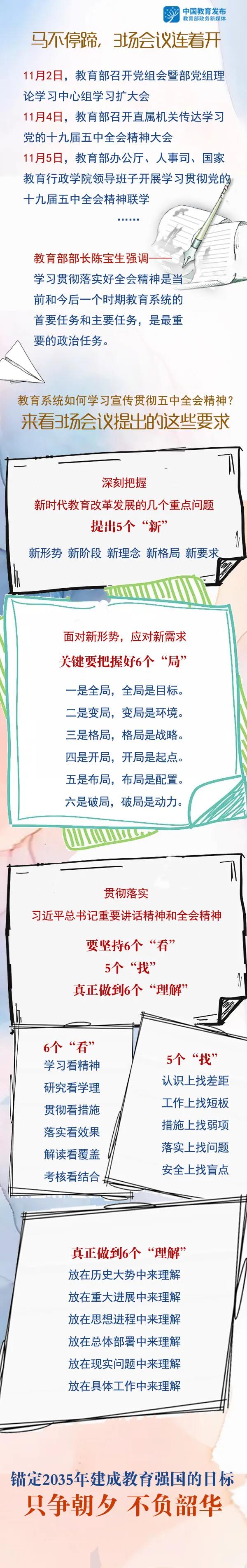 連日來,教育部連續(xù)召開會議,從黨組、機(jī)關(guān)到直屬單位,都迅速行動、精心部署學(xué)習(xí)宣傳貫徹五中全會精神——