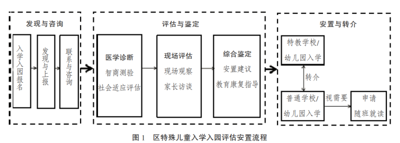 上海市于2016年9月成立了上海市特殊學(xué)生教育評估中心,對本市報(bào)名就讀特教學(xué)校(幼兒園)、普通學(xué)校(幼兒園)特教班的各類適齡殘障兒童組織開展各項(xiàng)教育評估工作。作為區(qū)域特殊教育管理和服務(wù)的專業(yè)機(jī)構(gòu),上海市徐匯區(qū)特殊教育指導(dǎo)中心(以下簡稱“區(qū)特教中心”)對接市特殊教育評估中心開展區(qū)內(nèi)特殊兒童各項(xiàng)教育評估工作,2019年初與區(qū)教育局招生考試中心(以下簡稱“區(qū)招考中心”)等相關(guān)部門共同制定《上海市徐匯區(qū)特殊學(xué)生評估安置流程 (學(xué)前/義務(wù)教育階段)》,形成了包含發(fā)現(xiàn)與咨詢、評估與鑒定、安置與轉(zhuǎn)介三階段的評估流程(詳見圖1)。