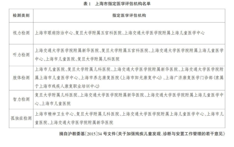 醫(yī)學(xué)診斷由上海市教委指定醫(yī)學(xué)評估機(jī)構(gòu)實(shí)施(機(jī)構(gòu)名單詳見表1)。區(qū)特教中心將確認(rèn)參與檢測的總名單發(fā)送至簽約的市級醫(yī)院,并與醫(yī)院協(xié)商、確定評估診斷的具體時(shí)間,再由醫(yī)院開設(shè)入學(xué)入園評估專場,如使用韋克斯勒智力測驗(yàn)、社會(huì)適應(yīng)評估量表等標(biāo)準(zhǔn)化評估工具對疑似智力障礙學(xué)生進(jìn)行智力檢測,并出具醫(yī)學(xué)診斷報(bào)告。另外,對于懷疑在視力、聽力、肢體等方面存在障礙的學(xué)生,則由指定的醫(yī)學(xué)評估機(jī)構(gòu)進(jìn)行視力檢測、聽力檢測、肢體檢測等。