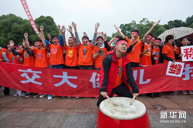 5月20日,在上海市青少年校外活動營地東方綠舟,上海交大的學生為自己學校加油。(新華社記者 金立旺 攝)