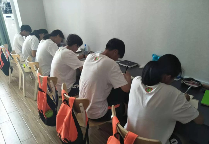 從食堂回到寢室,姑娘們手里把玩著撿來的幾顆圓圓的石子,靜靜等待九點(diǎn)的自習(xí)時(shí)間。這個(gè)暑假他們已經(jīng)參與了多個(gè)足球賽事,省賽、夏令營分營,幾乎把自己的暑假排得滿滿當(dāng)當(dāng),總營結(jié)束七天之后就要開學(xué)了。當(dāng)問到她們有沒有羨慕其他同學(xué)放假可以在家玩很久,姑娘們一致?lián)u頭——有喜歡的足球和好友作伴,這樣很充實(shí)。九點(diǎn)一到姑娘們便開始下床準(zhǔn)備自習(xí),即使沒有教練的安排和監(jiān)督,她們也都規(guī)規(guī)矩矩的坐到學(xué)習(xí)桌前打開書本,進(jìn)入到自習(xí)狀態(tài)。