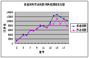 兩套教材每冊課文用詞和詞干的調(diào)查數(shù)據(jù)顯示:隨著年級增長,課文使用詞干、詞種均呈穩(wěn)步增長態(tài)勢,符合學(xué)生的認(rèn)知規(guī)律。兩套教材對比,普通班版教材的課文用詞隨年級冊號的變化曲線上升相對平穩(wěn),課文的詞干種與詞種數(shù)量相對較大,而雙語班版教材課文用詞,特別是中學(xué)階段用詞變化曲線相對起伏較大,詞種數(shù)量相對較小。