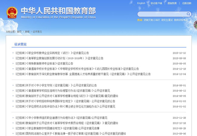 2. 推動(dòng)決策過(guò)程公開(kāi)。制定的《特殊教育教師專業(yè)標(biāo)準(zhǔn)》《高等職業(yè)教育創(chuàng)新發(fā)展行動(dòng)計(jì)劃(2015-2018年)》《職業(yè)學(xué)校教師企業(yè)實(shí)踐規(guī)定(試行)》等3項(xiàng)重要規(guī)范性文件草案均在門戶網(wǎng)站征求意見(jiàn)專欄向全社會(huì)公開(kāi)征求意見(jiàn),其中2項(xiàng)在廣泛聽(tīng)取了社會(huì)各方意見(jiàn)建議并修改完善后正式發(fā)布。在編制起草《普通高等學(xué)校高等職業(yè)教育(專科)專業(yè)設(shè)置管理辦法》《教育部重點(diǎn)實(shí)驗(yàn)室建設(shè)與運(yùn)行管理辦法》《中小學(xué)生藝術(shù)素質(zhì)測(cè)評(píng)辦法》等重要文件時(shí),廣泛聽(tīng)取了社會(huì)各方意見(jiàn)建議。在門戶網(wǎng)站征集教育“十三五”規(guī)劃建議建言,加強(qiáng)公眾參與。