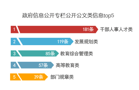 1. 通過(guò)公開(kāi)專欄公開(kāi)信息情況。通過(guò)政府信息公開(kāi)專欄公開(kāi)公文類信息共計(jì)507條,教育部政策公文中非涉密普發(fā)下行文78% 做到了主動(dòng)公開(kāi)。其中位于前5位的信息是:干部人事人才類181條,占比35.70%;發(fā)展規(guī)劃類119條,占比23.47%;教育綜合管理類85條,占比16.77%;高等教育類57條,占比11.24%;部門規(guī)章類39條,占比7.69%;其他26條,占比5.13%。