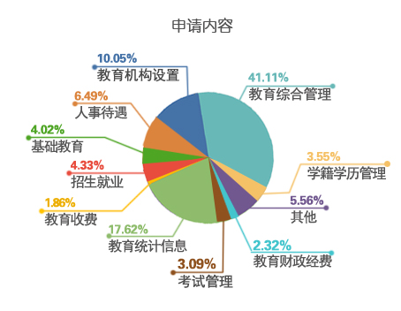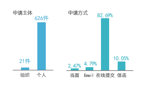 1.申請(qǐng)情況。1月1日至12月31日,共收到公民、法人和其他組織通過(guò)各種形式提出的信息公開(kāi)申請(qǐng)647件,較2014年的281件增長(zhǎng)了130%。從申請(qǐng)的主體看,公民個(gè)人提出的申請(qǐng)626件、其他組織提出的申請(qǐng)21件。從申請(qǐng)方式看,當(dāng)面申請(qǐng)16件,占2.47%;以電子郵件方式申請(qǐng)31件,占4.79%;以紙質(zhì)信函方式申請(qǐng)65件,占10.05%;以在線提交方式申請(qǐng)535件,占82.69%。涉及教育綜合管理的266件,占41.11%;涉及教育統(tǒng)計(jì)信息的114件,占17.62%;涉及教育機(jī)構(gòu)設(shè)置的65件,占10.05%;涉及人事待遇的42件,占6.49%;涉及招生就業(yè)的28件,占4.33%;涉及基礎(chǔ)教育的26件,占4.02%;涉及學(xué)籍學(xué)歷管理的23件,占3.55%;涉及考試管理的20件,占3.09%;涉及教育財(cái)政經(jīng)費(fèi)的15件,占2.32%;涉及教育收費(fèi)的12件,占1.86%;其他36件,占5.56%。申請(qǐng)內(nèi)容涉及教育部20個(gè)業(yè)務(wù)司局。