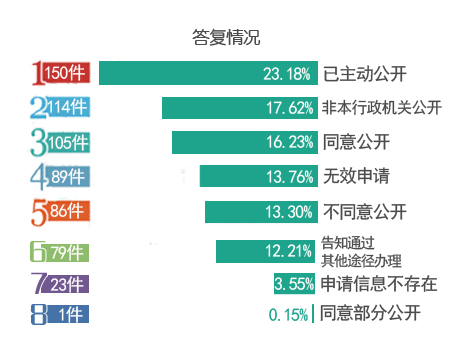 2.答復(fù)情況。647件申請(qǐng)已全部按時(shí)答復(fù)申請(qǐng)人,其中“已主動(dòng)公開(kāi)”的150件,占23.18%;“同意公開(kāi)”的105件,占16.23%;“同意部分公開(kāi)”的1件,占0.15%;“不同意公開(kāi)”的86件,占13.30%;“不屬于本行政機(jī)關(guān)公開(kāi)”的114件,占17.62%;“申請(qǐng)信息不存在”的23件,占3.55%;“告知通過(guò)其他途徑辦理”的79件,占12.21%,無(wú)效申請(qǐng)89件,占13.76%)。